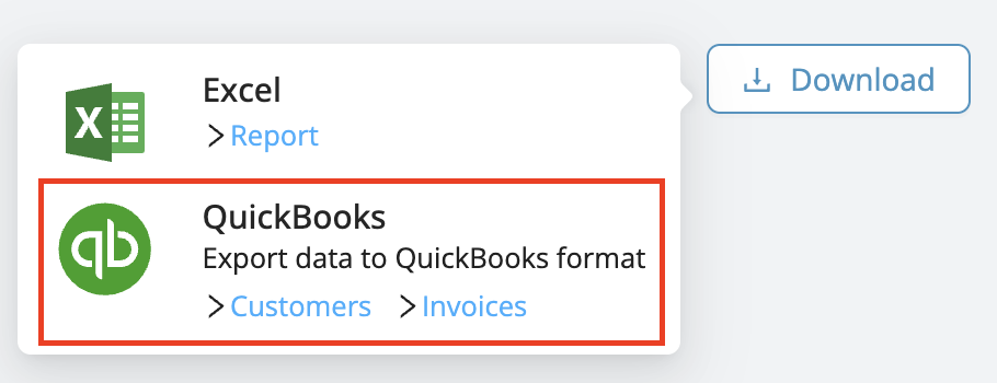 From the Reports > Client Pricing view, use the QuickBooks export actions to download Customers and Invoices